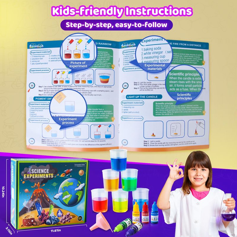 - 【Easy-to-Follow Instructions】Professional scientific instructions with clear illustrations ensure that kids can follow along and complete each experiment with minimal supervision, building confidence and independence. Our instructions clearly show the steps of 70 experiments, the scientific principles, and the usage and dosage of each step.