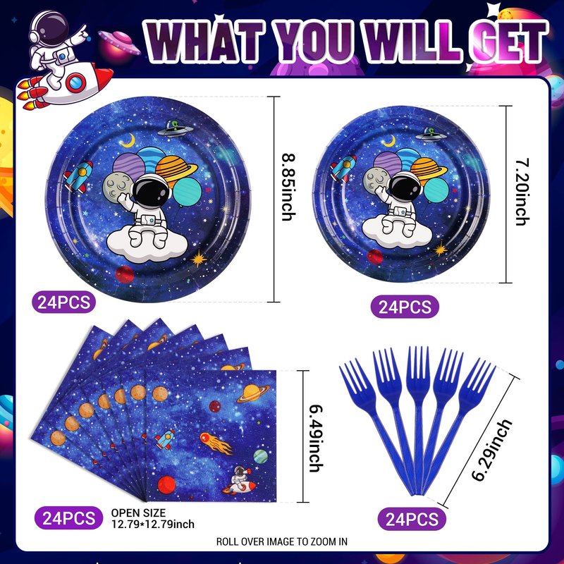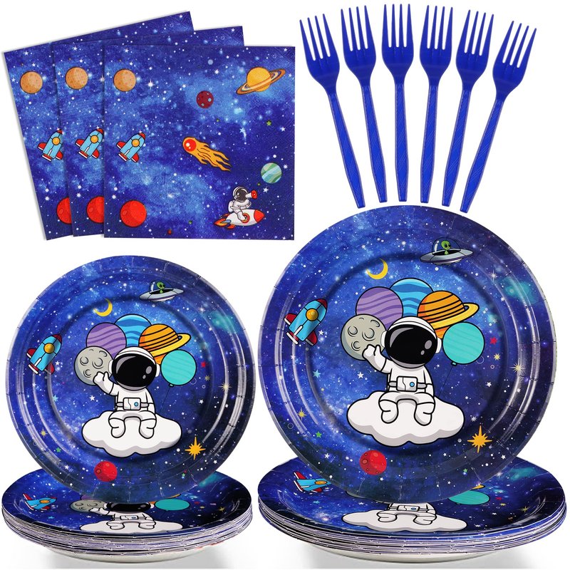 - Space Party Supplies Kit Serves for 24 Guests- Galaxy Themed Party Decoration is designed with astronaut, space planet and shooting stars, party tableware set includes 24 9" party paper plates, 24 7" plates, 24 6.5" space napkin and 24 plastic blue forks, Make sure you have enough for any solar system party favors or event.