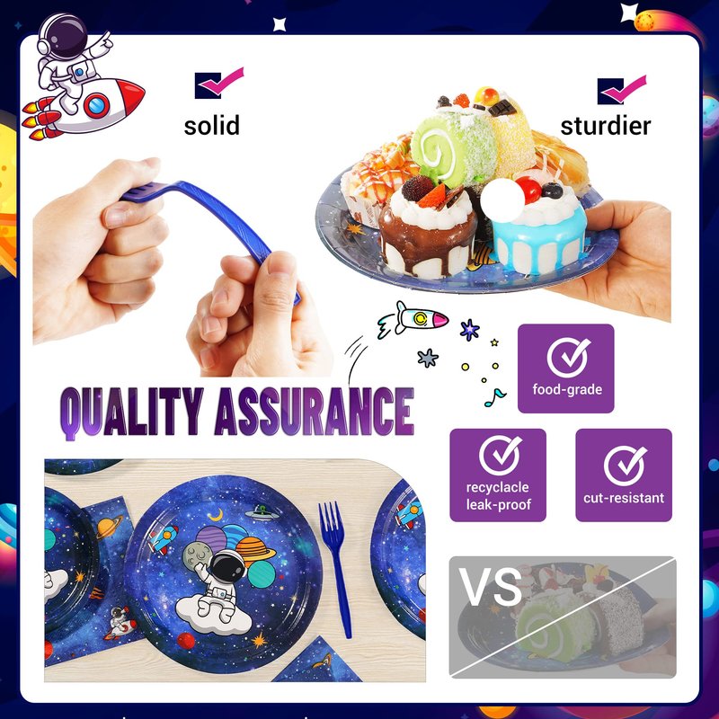 - Party Plates with Premium Quality- The Galaxy party supplies pack is designed to galaxy nebulous pattern printed and fade resistant to give you a party full of astronaut themed vibes. All our party plates and napkins are made of high quality paper, non-toxic, odor free, heat resistant and durable. The blue forks will not bend, break. Bright color, high-grade feeling.