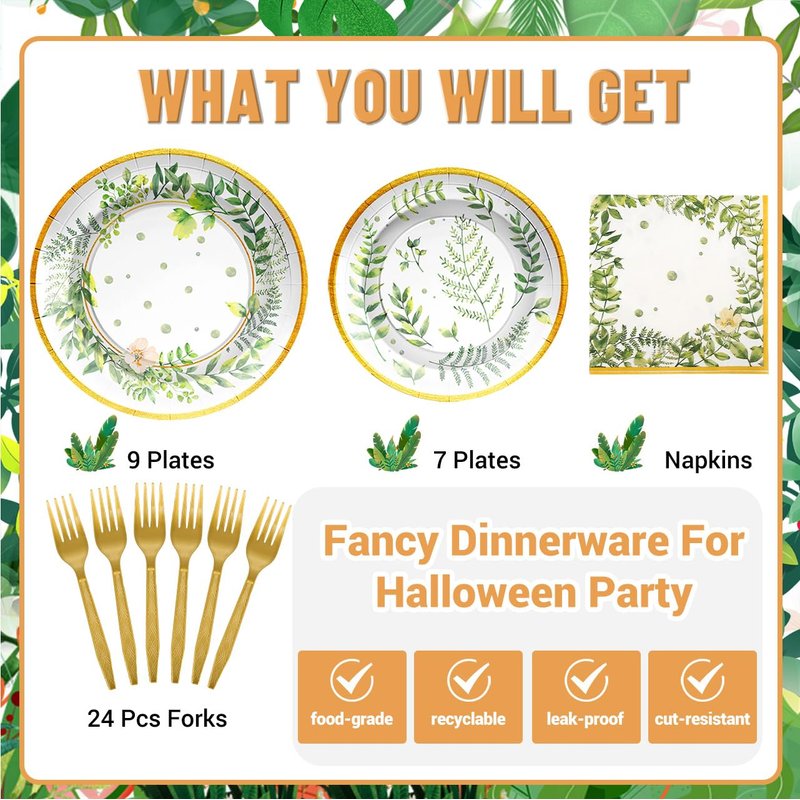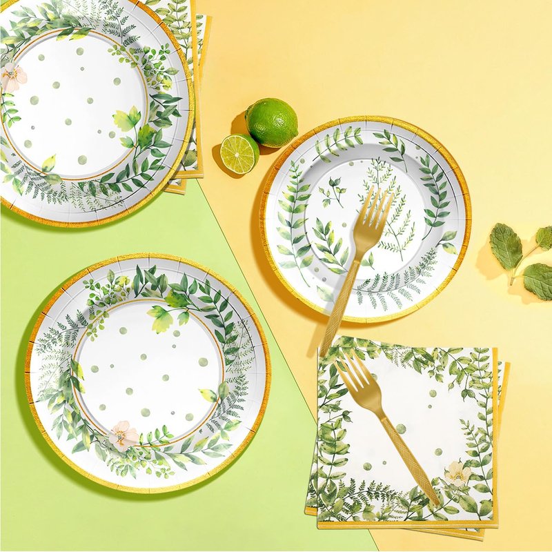 - GREENERY BABY SHOWER DECORATIONS SERVES 24: You'll receive greenery party supplies set include 24pcs 9"greenery paper plates,24pcs 7" greenery party plates, 24pcs 6.5" greenery themed birthday party supplies napkins, and 24pcs plastic green forks in line with greenery theme, each set serves 24 people guests. It is excellent choice for anyone looking to host a memorable greenery themed event.