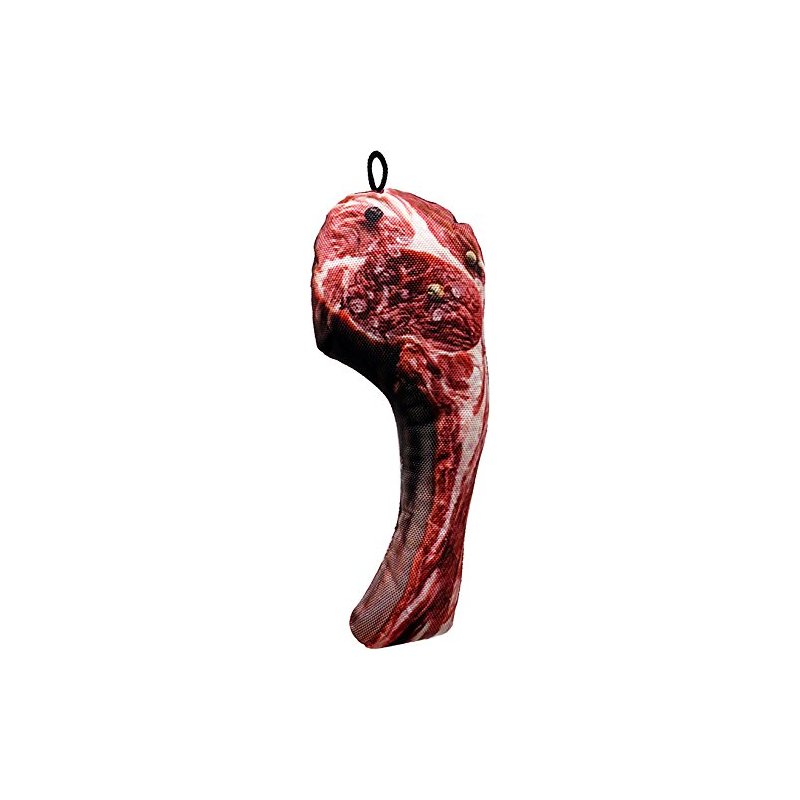 - A realistic looking T-bone steak plush dog toy