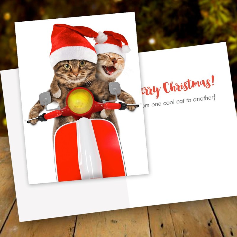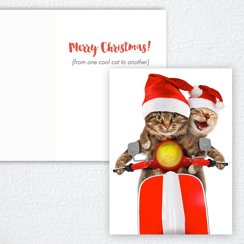 Scooter Cats Holiday Card Pack / 25 Animal Humor Greeting Cards With Envelopes/Funny Scooter Cat Santa Hat Design Featuring Christmas Message Inside