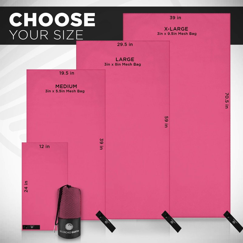 THE NEW WAY TO DRY This will be your new favorite towel. Why? Because not only is it ULTRA ABSORBENT, it is also VERY LIGHTWEIGHT. Weighing less than 10 oz when packed, this towel will be your go-to for EVERYTHING. BENEFITSQUICK DRYING – Made from 100% micro fibers that are thin and light, enabling this towel to dry up to 10x faster than regular bulky cotton towels SUPER LIGHTWEIGHT & COMPACT – Weighing less than 10 oz & packing into a compact few inches, the towel will take up less space in your travel bag. Thin enough to fit anywhere without losing any of its absorbance!CONVENIENT – Comes with an easy to carry carabiner clip that clips onto your backpack. The hanging loops with a snap clip make it convenient to snap on any hook or space you need. MULTIFUNCTIONAL – Take your towel with you wherever you go! Need a beach towel? A sports towel? A yoga towel? Or maybe you just need to wrap your hair in a quick turban wrap or a body towel after a relaxing shower? Whatever your life needs, our microfiber towel will help make your life easier!PRODUCT SPECIFICATIONS - Large: 30 x 60 in (75 x 150 cm)- Medium: 20 x 40 in (50 x 100 cm)- Small: 12 x 24 in (30 x 60 cm)- 80% Polyester and 20% Nylon- 200 GSM (Grams per square meter) density PACKAGE CONTENTS:- Large Set: 2 Towels (1 Large, 1 Small), 1 Mesh Bag, 1 Carabiner Clip; 8 x 3 in & 10 oz- Medium Set: 2 Towels (1 Medium, 1 Small), 1 Mesh Bag, 1 Carabiner Clip; 5.5 x 3 in & 6 oz 100% SATISFACTION GUARANTEED If you’re not happy, we’re not happy! If you are not completely satisfied with your purchase, we’ll provide an exchange or refund hassle-free. IMPORTANT WASH INSTRUCTIONS: MACHINE WASH IN COLD WATER ALONE OR WITH LIKE COLORS AIR DRY FLAT OR TUMBLE DRY LOW DO NOT BLEACH OR USE FABRIC SOFTENER DO NOT IRON