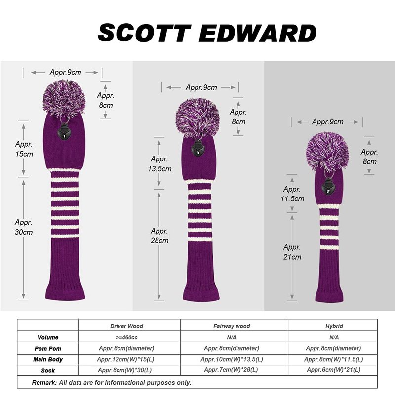 Scott Edward Stripes Style Knitted Golf Club Head Covers Set of 3, fit for Driver Wood(460cc), Fairway Wood, Hybrid(UT), for Men/Women Golfers, Individualized Looking and Washable (Purple)