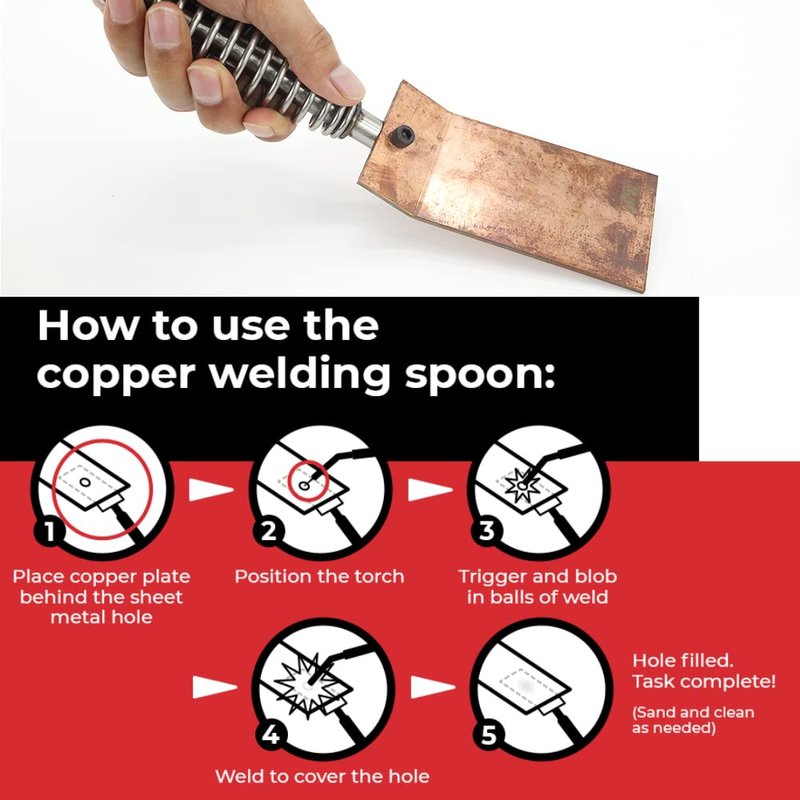 - {Must Have Welder Accessories}------The copper welding spoon backer equipped with 3 angled spoons: flat curved and 90 degree to plug weld at any angle