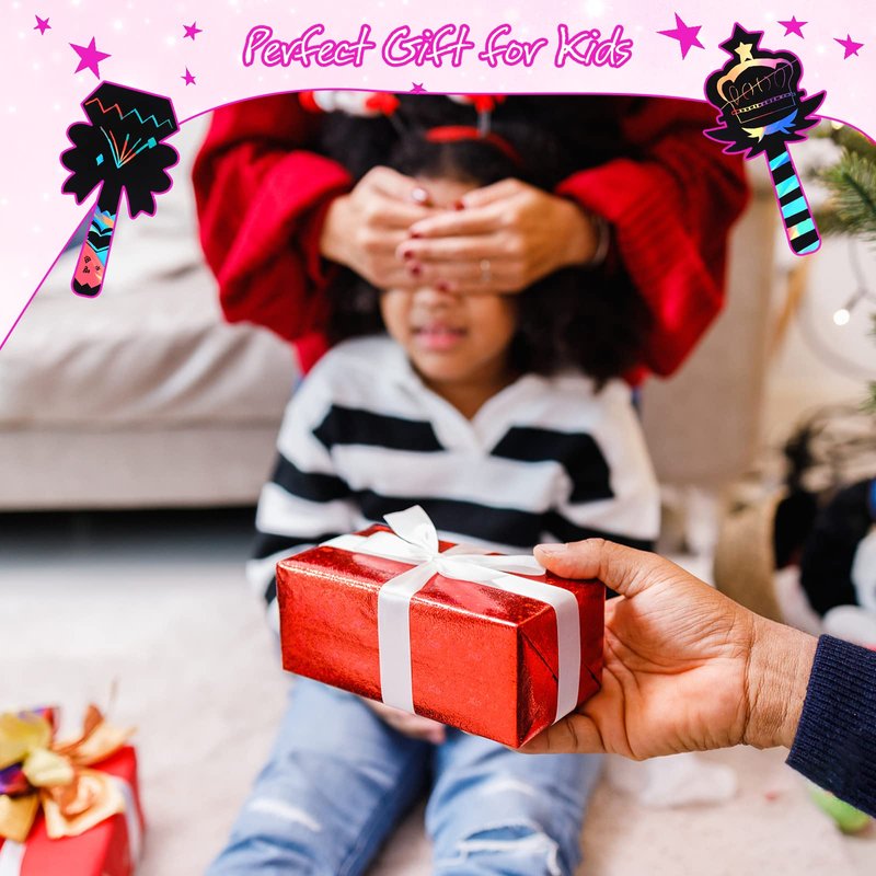 - 【Waving wand and firing magic】Thanks to the fixed design, kid can wave a wand that can be held up and straightened. Using the rainbow scratch paper wand, kids can play games together, and carve their blessings on the wand scratch paper for friends