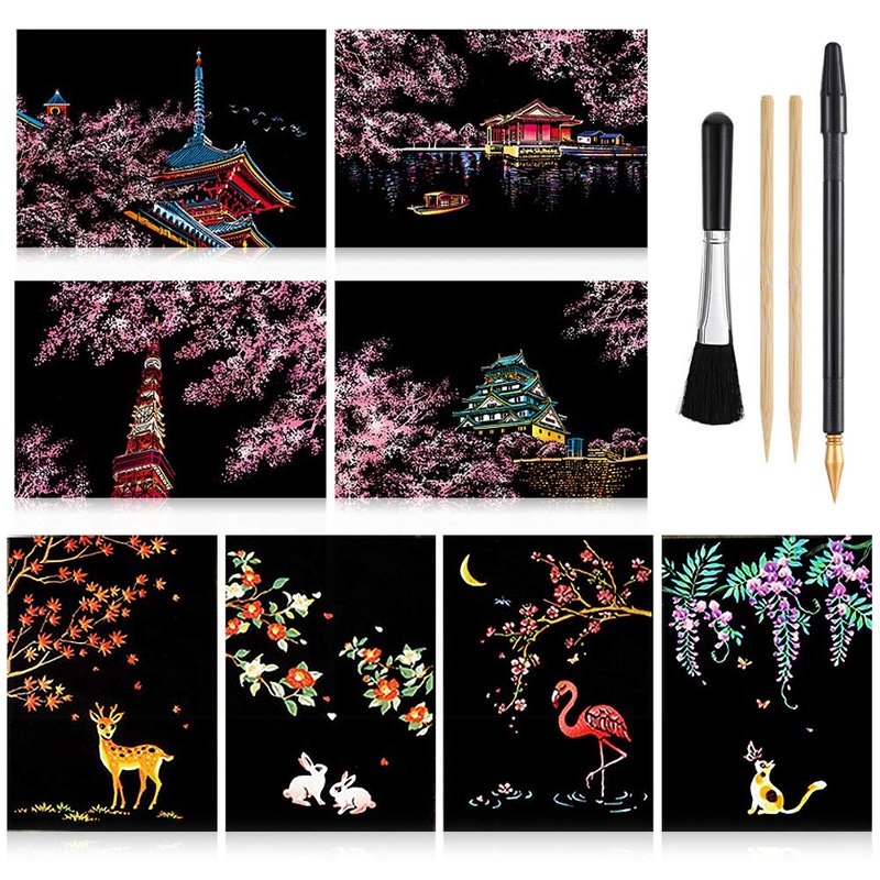 Scratch Paper Art Set, 8 Sheets Rainbow Painting Scratch Off Art Cherry Blossom & Animal Mini Postcard, Art Craft Supplies for Adults Girls & Boys Thanksgiving Christmas Birthday Party Game Gift