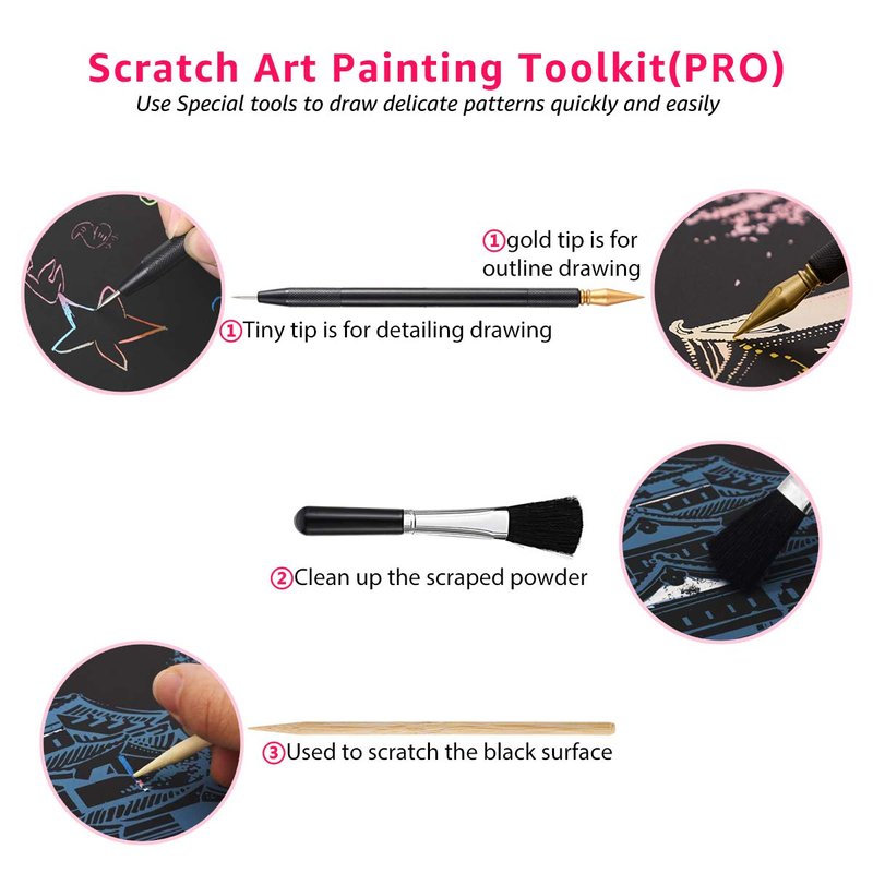 1 x Black Scratch Pen (gold tip is for outline drawing, Tiny tip is for d etailing drawing)
