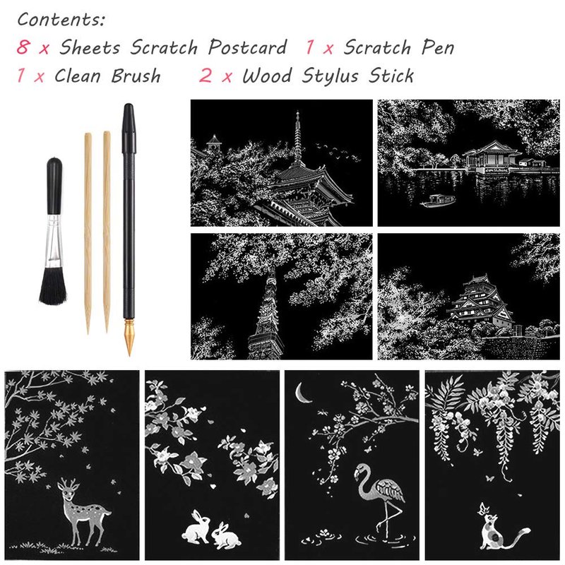 - 【Package Including】: 8 x Scratch Drawing Cards, (Cherry Blossom & Animal 7.9''x 5.5''), 1 x Scratch Pen, 1 x Clean Brush, 2 x Wood Stylus Stick.