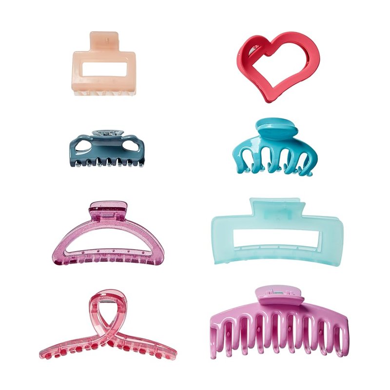 - VARIETY IN ONE COLLECTION: 6 cm claw clip in matte gray, 9 cm loop-shaped in translucent pink, 7 cm octopus in blue, 11 cm rectangular claw clip in translucent blue, 8.5 cm open-cut claw clip in glittery purple, 11 cm barrel claw clip in purple, 7 cm heart-shaped in pink, 5 cm square-shaped in translucent blush