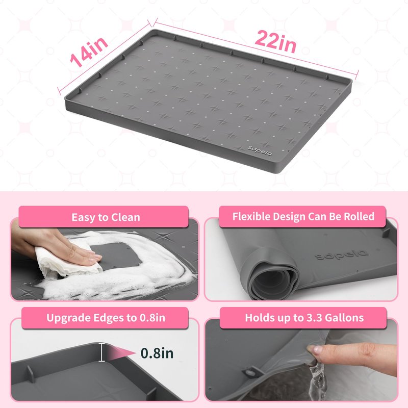 - EASY TO INSTALL AND MAINTAIN:The size of Sdpeia under sink mat is 22 inches long, 14 inches wide, and 0.8 inches high. It has excellent flexibility, perfectly fitting most family kitchen cabinets. Simply lay it down in your cabinet, and you're done! They can be easily trimmed to fit around pipes and other obstructions, ensuring a snug and secure fit.
