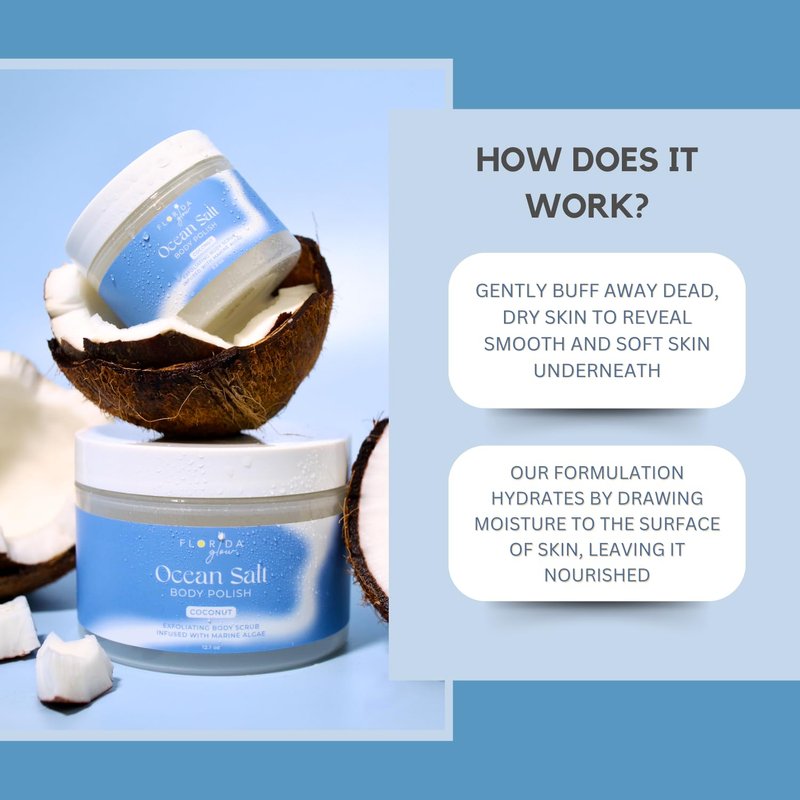 Sea Salt Body Scrub by Florida Suncare - Ocean Salt Body Polish Infused with Marine Algae - Exfoliating Face and Body Scrub - Facial Scrub Exfoliator to Tackle Acne and Scars (Coconut, 12.1 oz)