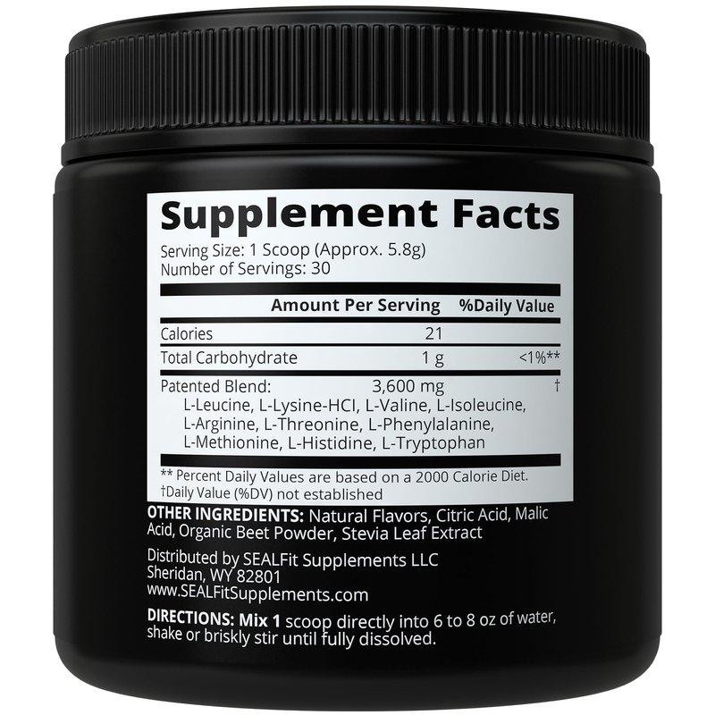 SEALFIT Essential Amino Acids Powder – Power Your Body and Mind SEALFIT Essential Amino Acids Powder delivers a potent blend of all 9 essential amino acids (EAAs), including branched-chain amino acids (BCAAs), to fuel your workouts and recovery. Designed to meet the rigorous physical and mental demands of elite-level training, this supplement is perfect for pre-workout, during workouts, or post-workout recovery. With its clean, vegan-friendly formula and refreshing Berry flavor, SEALFIT stands out as the select choice for fitness enthusiasts, athletes, and anyone pursuing a healthy lifestyle. SEALFIT’s complete amino acid profile ensures your body receives the nutrients it cannot produce on its own. This blend supports muscle repair and helps your body recover faster, making it easier to return to your workouts stronger. Unlike sugary energy drinks or stimulant-heavy pre-workouts, SEALFIT’s caffeine-free formula provides clean, natural energy that sustains you through intense sessions without crashes or jitters. The addition of BCAAs further enhances endurance and optimizes muscle performance, making it a powerful tool for those aiming to push their physical limits. Designed to nourish both body and mind, SEALFIT also promotes mental clarity and focus. Its formulation aligns with the principles of mental toughness inspired by Navy SEAL training, helping users stay sharp and resilient under pressure. Whether you’re tackling an intense workout or a demanding task, this supplement supports your ability to perform at your best, both physically and mentally. Crafted with clean ingredients, SEALFIT Essential Amino Acids Powder is vegan, NON-GMO, and free from common allergens such as gluten, soy, dairy, and added sugars. It fits seamlessly into a variety of dietary lifestyles, ensuring that everyone from athletes to clean eaters can benefit from its potent formulation. And with its vibrant Berry flavor, SEALFIT transforms your supplement routine into an enjoyable experience, free from the chalky aftertaste often associated with amino acid powders. Using SEALFIT is simple and convenient. Mix one scoop with water or your favorite beverage 20–30 minutes before exercise to boost energy and endurance. Alternatively, take it during your workout to stay hydrated and energized or after your session to aid muscle recovery and reduce downtime. With approximately 30 servings per container, SEALFIT is designed to easily fit into your daily fitness routine without requiring complex preparation. The formula is developed with safety and transparency in mind. Each batch undergoes third-party testing to ensure purity, potency, and quality, providing peace of mind that you’re consuming a clean and effective product. Nutritional information is clearly listed on the packaging, so you always know exactly what you’re putting into your body. Additionally, the recyclable, eco-friendly packaging reflects SEALFIT’s commitment to sustainability. SEALFIT Essential Amino Acids Powder is ideal for a wide range of users. Athletes and fitness enthusiasts will benefit from its ability to enhance endurance, build muscle, and speed recovery. Vegans and individuals with dietary restrictions will appreciate its allergen-free formulation. For those inspired by Navy SEAL training principles, SEALFIT provides the nutrients needed to fuel both the body and mind, helping you develop resilience and focus. When it comes to supporting energy, recovery, and mental focus, SEALFIT Essential Amino Acids Powder delivers unmatched value. Its blend of EAAs and BCAAs provides essential building blocks for muscle repair and growth while offering a clean energy boost to power through even the most demanding workouts. Whether you’re training for a competition, pursuing a fitness goal, or simply seeking a healthier lifestyle, SEALFIT supports you performing at your best.