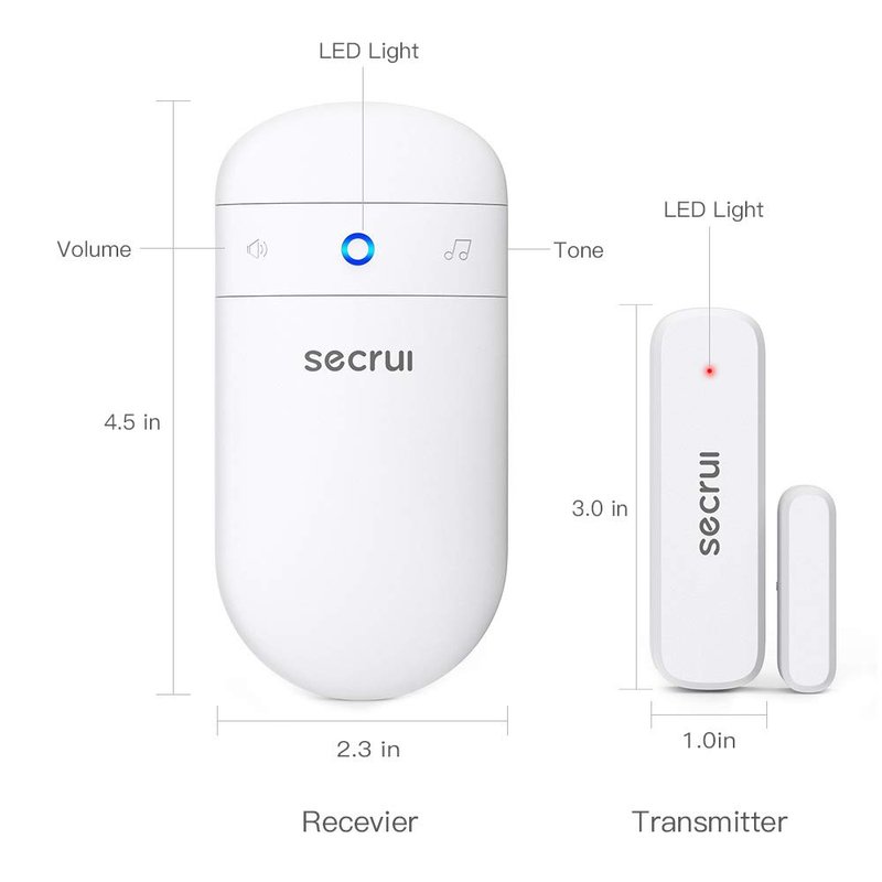 SECRUI is all about making your home or business a safer and more secure environment where you and your loved ones can feel protected at all times. Whether you want to make sure your child won’t leave any room without you knowing or you’re afraid of the possibility of a break-in, our door alarm is the right choice for securing your home. It uses a simple magnetic strip design that automatically alerts you when it’s separated, so you know if a certain door or window has been opened. The door notification sensor is very easy to install and requires no unique tools or technologies. What makes this product special? This amazing doorbell chime features 52 different ringtones, including a special Christmas one. The chimes are fully adjustable, so you can pick any one of the 5 volume levels. To make things even easier. The door motion sensor chime has built-in LED indicators for a visual effect designed to complement the ringtone. Some features to keep in mind about our product: Working range: 500ft; Can be used with additional SECRUI door sensors or doorbells; Suitable for your home/office/store; Can be installed at any door or window; Advanced magnetic strip mechanism; Dual installation; 5 volume levels from 0-110dB; Built-in LED indicators; Memory function; 52 chime ringtones with Christmas song; Battery-operated wireless design. The complete set includes: 2 x Receivers 3 x Door Sensors Enjoy a safe and secure environment with our amazing door chime!