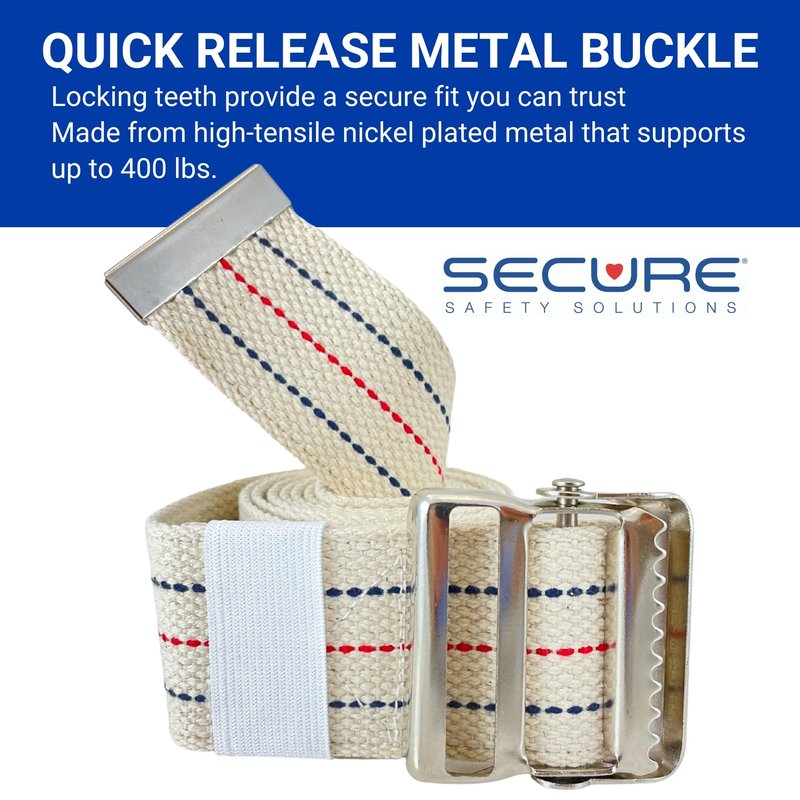 - 60 Inch Gait Belt for Seniors: The SGBM-60S 60" x 2" gait belt by Secure Safety Solutions is designed to help nurses and caregivers safely transfer, lift, or walk with elderly fall-risk patients and residents. This durable medical gait belt strap helps to safely assist patients when walking or transferring from a bed, chair, wheelchair, etc. The metal buckle provides secure & easy closure. This medical safety mobility aid helps prevent elderly falls and reduce caregiver injury