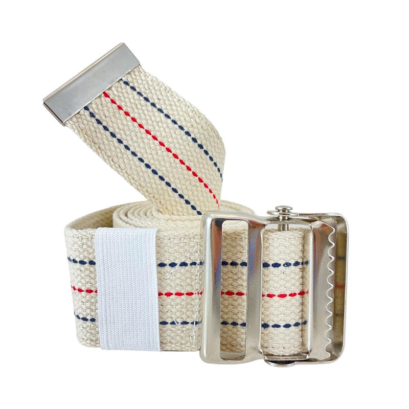 The Secure Safety Solutions SGBM-60S 60"W x 2"L beige striped gait belt with high-tensile metal buckle is an essential transfer and walking safety aid for nurses and caregivers. It's designed to assist in walking or transferring fall-risk patients, residents, and loved ones, while also preventing caregiver injury. With an adjustable length of up to 60 inches and a weight capacity of 400 lbs, this gait belt is built to last. Personal Safety Corporation is committed to producing top-quality elderly fall prevention and patient safety products at unbeatable prices. Trust in our brand, trusted by professional care facilities in the US, Canada, and Europe since 1991.