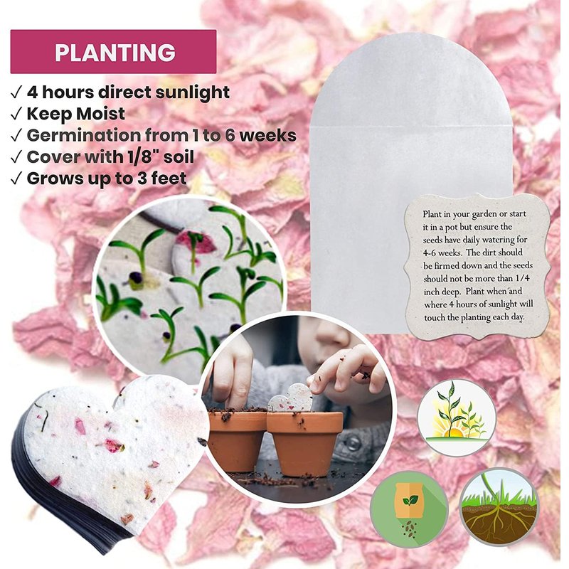 - SEED BLOOM BLOOM & GROW HEARTS SEED PAPER TAGS AND GIFT CARDS — 24 pieces of seeded paper cards in loveable heart shapes. Each card is embedded with pink larkspur petals and measures 2.85" wide by 2.5" tall. Though mostly used for romantic events, the heart is a shape associated with love, gratitude, and appreciation so it's very useful for all occasions. A simple yet sweet way of expressing a never-ending love through plantable paper hearts is definitely unforgettable.
