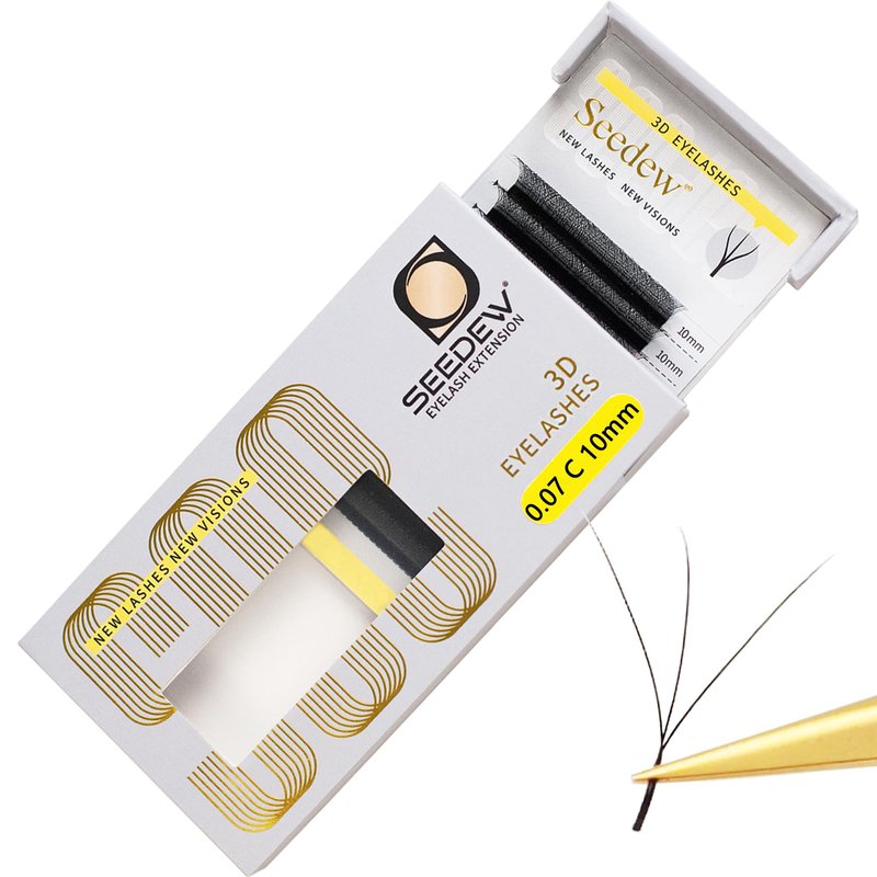 SEEDEW 3D Lash Extensions, 0.07mm C Curl 10mm 12 Rows/Tray, W Shape Flat Stem, Korean PBT Soft Natural False Eyelashes Grafting for Beginner Artist, Lash Tech, Beauty Salon(3D-Matte Black-0.07-C-10mm)