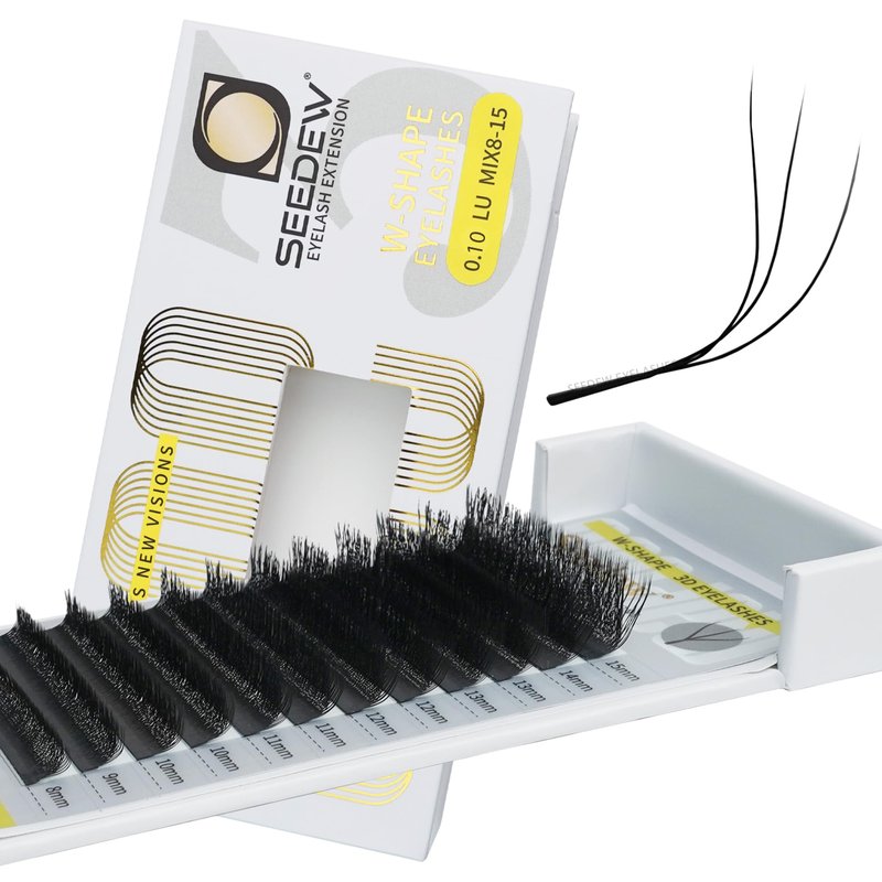 SEEDEW 3D Lash Extensions, 0.10mm LU/M Curl MIX8-15mm 12 Rows/Tray, W Shape Flat Stem, PBT Natural Eyelash Grafting for Beginner Artist, Lash Tech, Beauty Salon(3D-Matte Black-0.10-LU-MIX8-15mm)