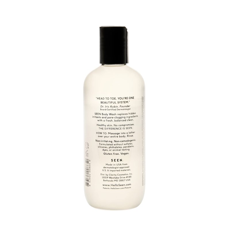 - WHAT IT IS: Developed by a dermatologist, this body wash provides SEEN’s non-irritating, non-comedogenic benefits for every square inch of your skin. The mild formula features naturally-derived, sulfate-free surfactants that leave skin feeling fresh and balanced, while removing hidden irritants and pore-clogging oils.