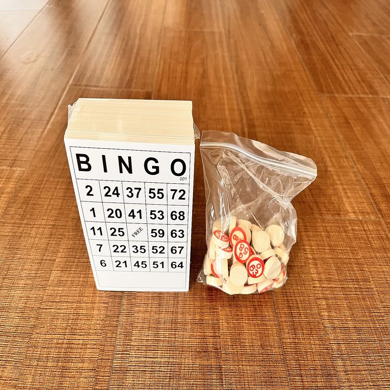 - 120 sheets of unique bingo cards and 75 wooden playing pieces.