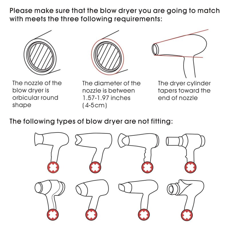 - Great Compatibility: fit with most blow dryers with nozzle 1.57~1.97inch/4-5cm ( Please see the pictures for instructions of the blow dryers that would fit). The rubber base will stretch and hug your blow dryer. All you need is to push it down and make it snug.