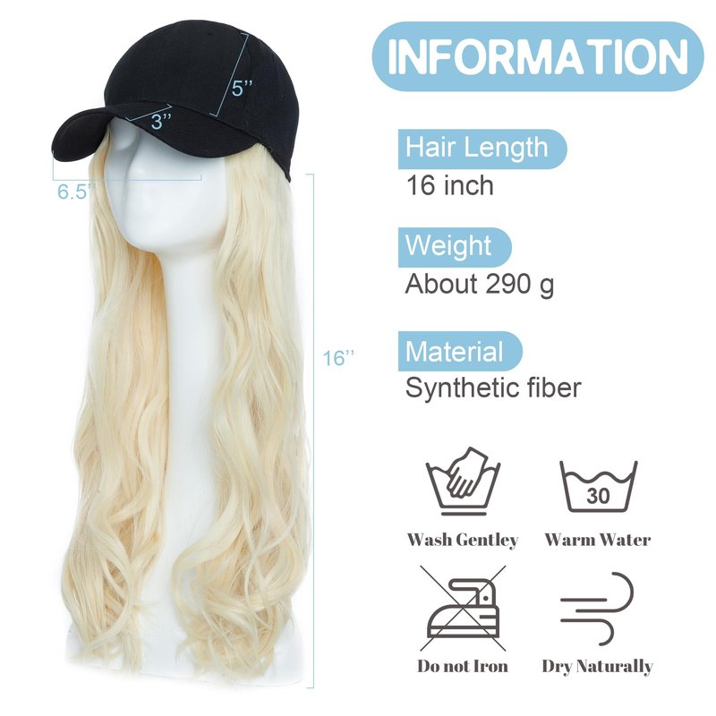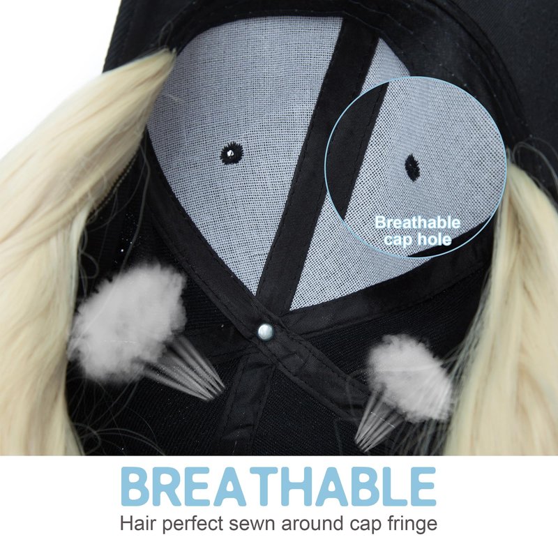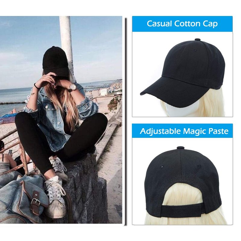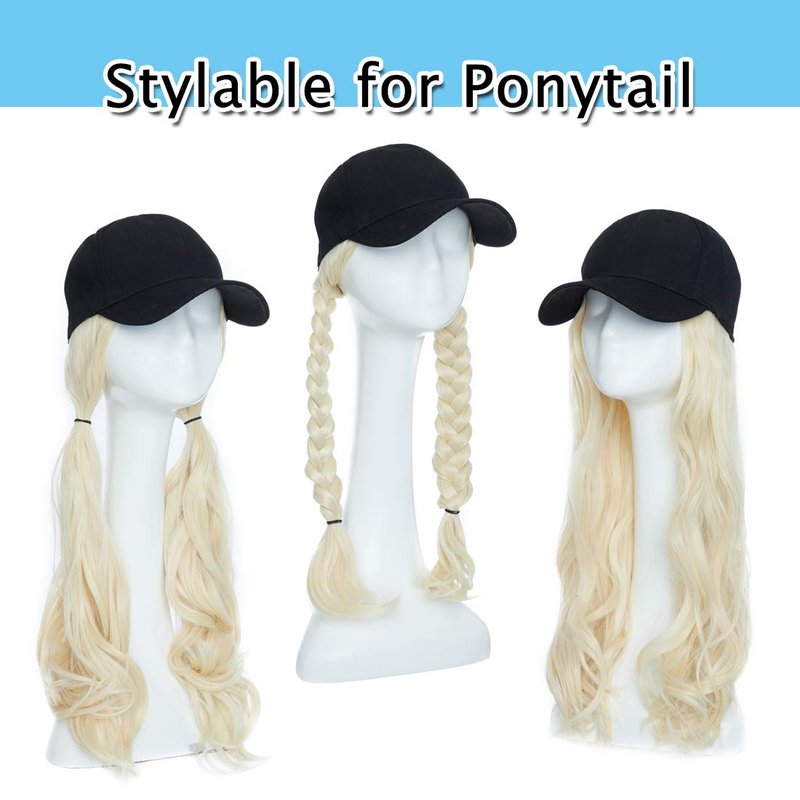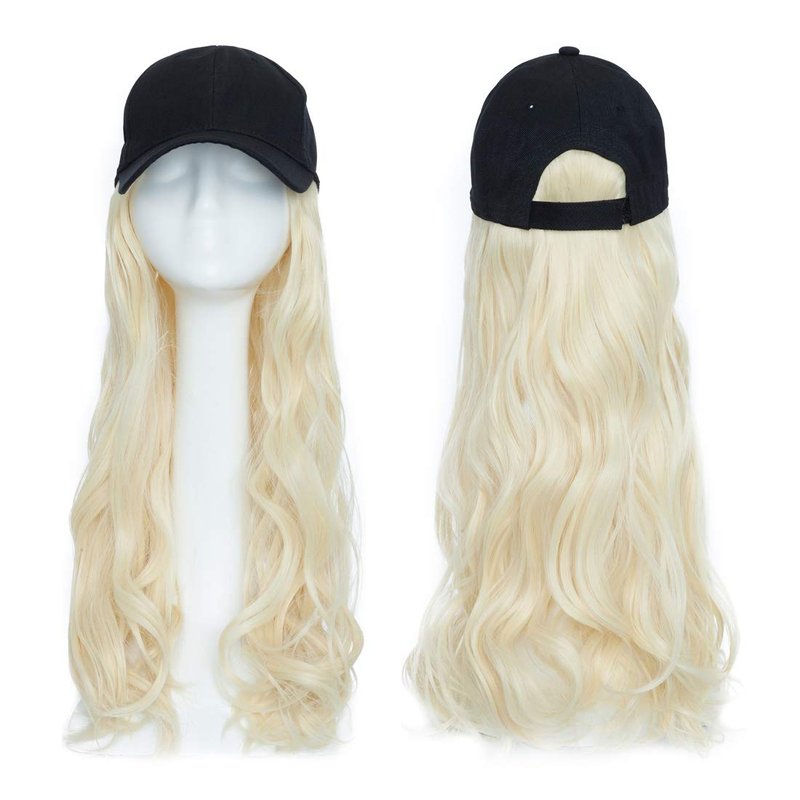 SEGO Baseball Cap with Hair Extensions for Women Adjustable Hat with Hair Attached Synthetic Long Wavy Wig with Black Hat Stylable for Pigtail Ponytail 16 Inch Bleach Blonde 290g