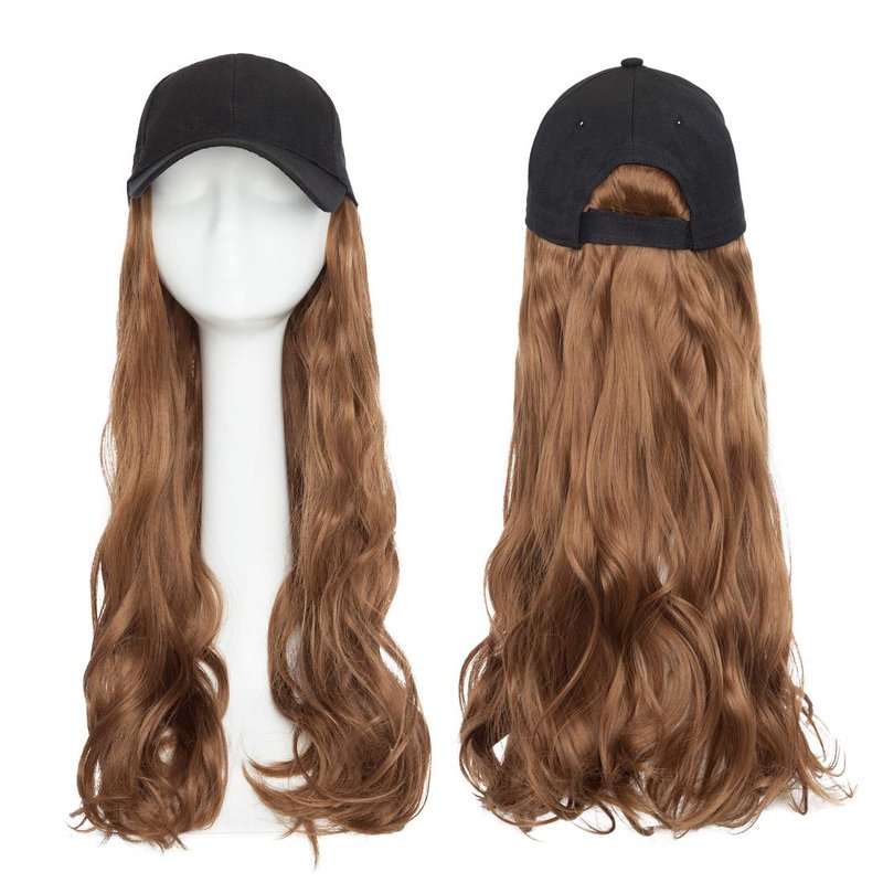 SEGO Baseball Cap with Hair Extensions for Women Adjustable Hat with Hair Attached Synthetic Long Wavy Wig with Black Hat Stylable for Pigtail Ponytail 16 Inch Light Brown 290g