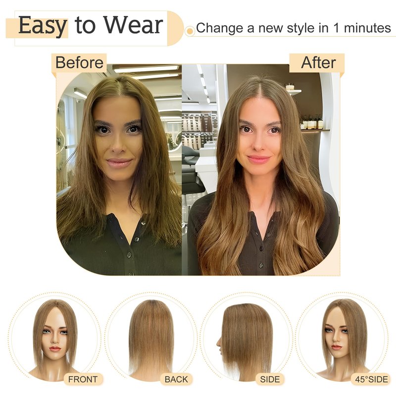 - ♛100% real human hair topper♛ Shedding and tangle free, no synthetic mix, no animal fabric mix, can be washed, dyed, curled and straightened. (Avoid ironning the hair with high temperature-advise 100-120 degree)