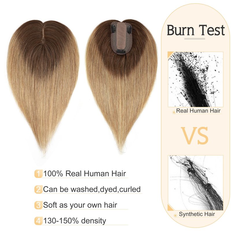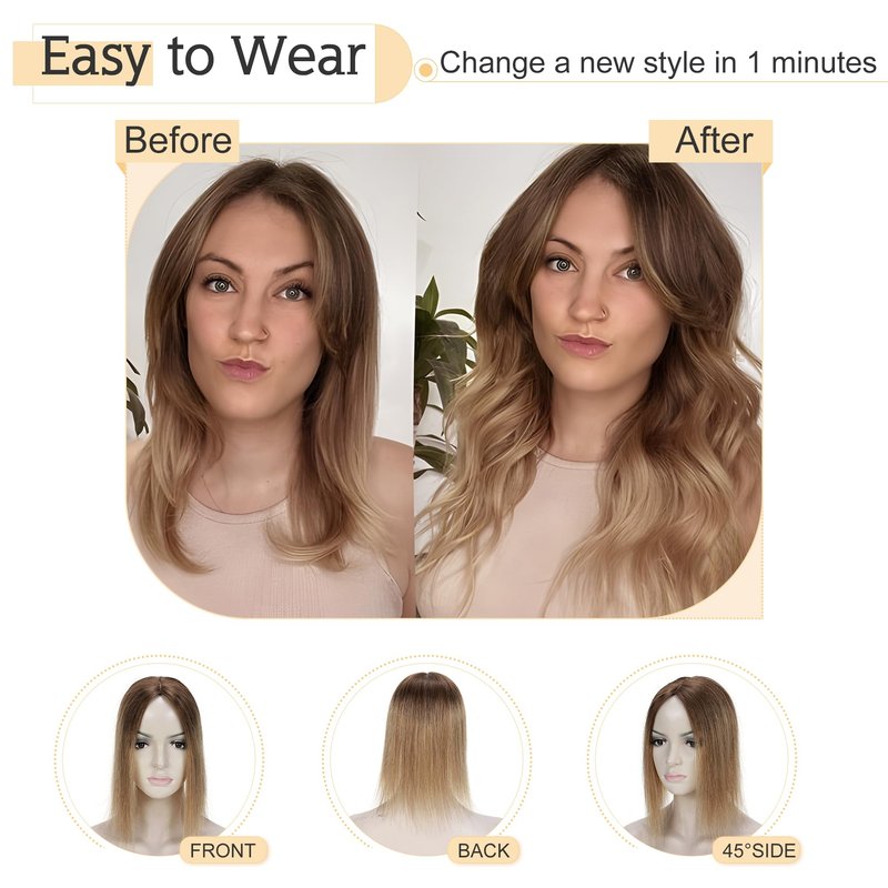 - ♛100% real human hair topper♛ Shedding and tangle free, no synthetic mix, no animal fabric mix, can be washed, dyed, curled and straightened. (Avoid ironning the hair with high temperature-advise 100-120 degree)
