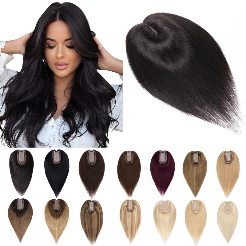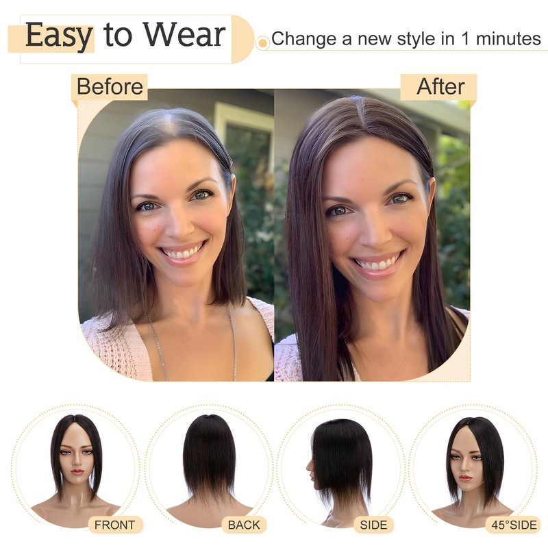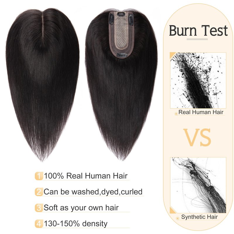 - ♛100% real human hair topper♛ Shedding and tangle free, no synthetic mix, no animal fabric mix, can be washed, dyed, curled and straightened. (Avoid ironning the hair with high temperature-advise 100-120 degree)