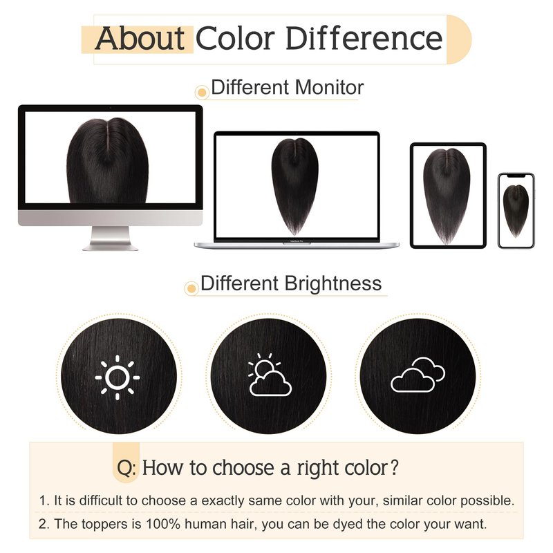 - ♛About color difference♛ Color might be slightly different from the picture showed considering light and different monitor. But since it’s real human hair, the topper can be dyed to the exact color you want if needed.