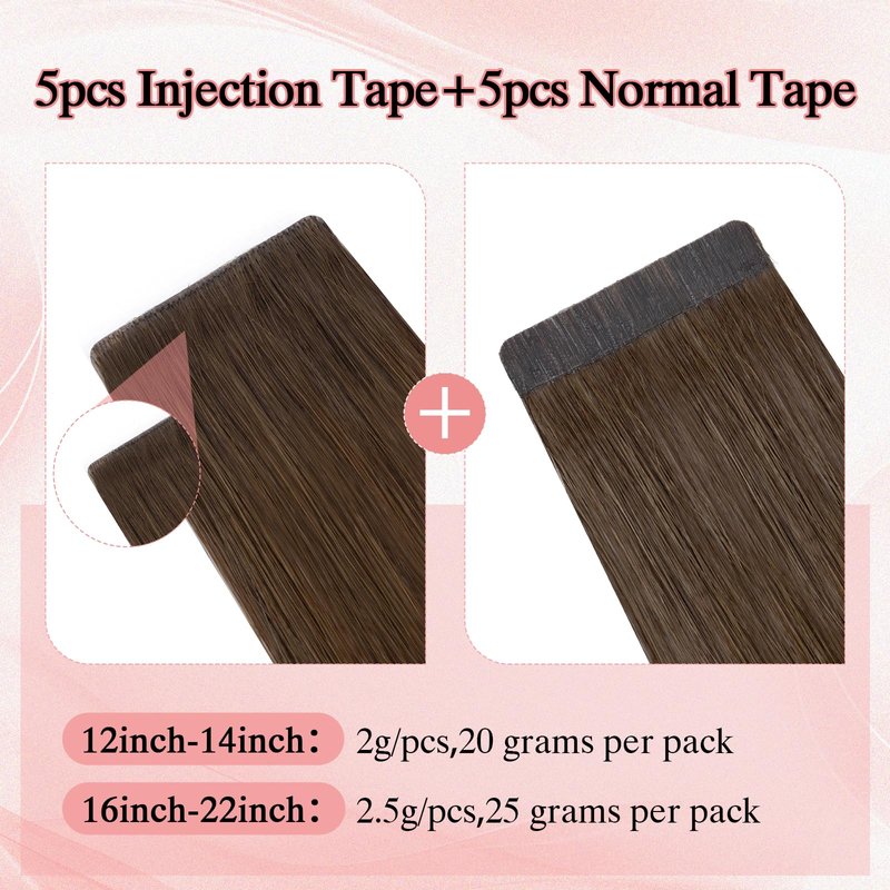 - Weight and length: Length: 12-22 inches, 12-14 inches: 5 pieces of invisible injection hair extension tape, 10g, 2g/piece, 5 pieces of normal, 10g, 2g/piece; 16-22 inches: 5 pieces of invisible injection, 12.5g, 2.5g/piece, 5 pieces of normal, 12.5g, 2.5g/piece; Replacement hair extension tape * 12.