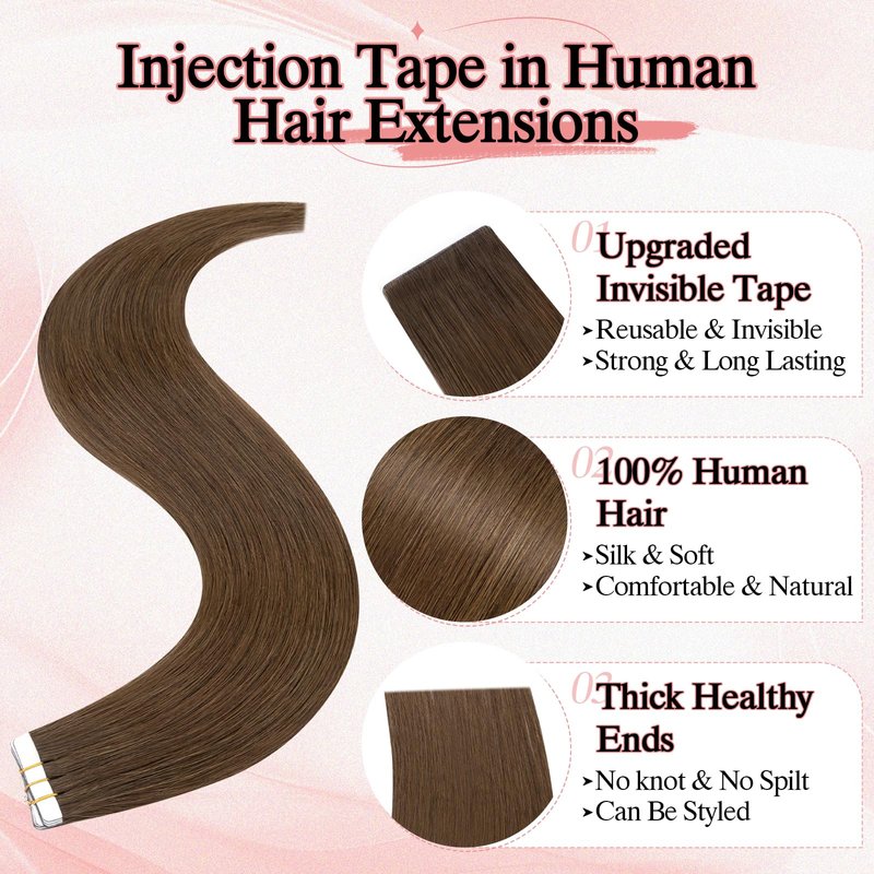 - Ingection Tape in Hair Extension:Ingection Tape in Hair Extensions uses a unique injection technology to create the natural look of hair growing directly from the scalp, making them 100% invisible for a more natural, more discreet extension result.