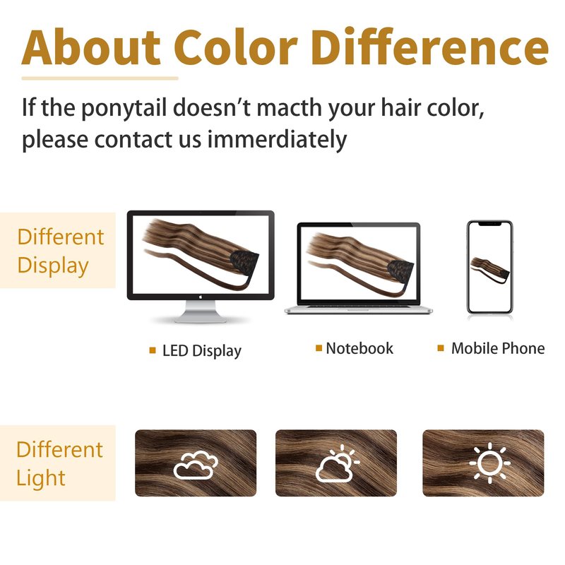- ♛About Color Difference♛—Color might be slightly different from the picture showed considering light and different monitor. But since it’s real human hair, the ponytail can be dyed to the exact color you want if needed. If you have difficulties in choosing, fwe will help you to make the right choice.