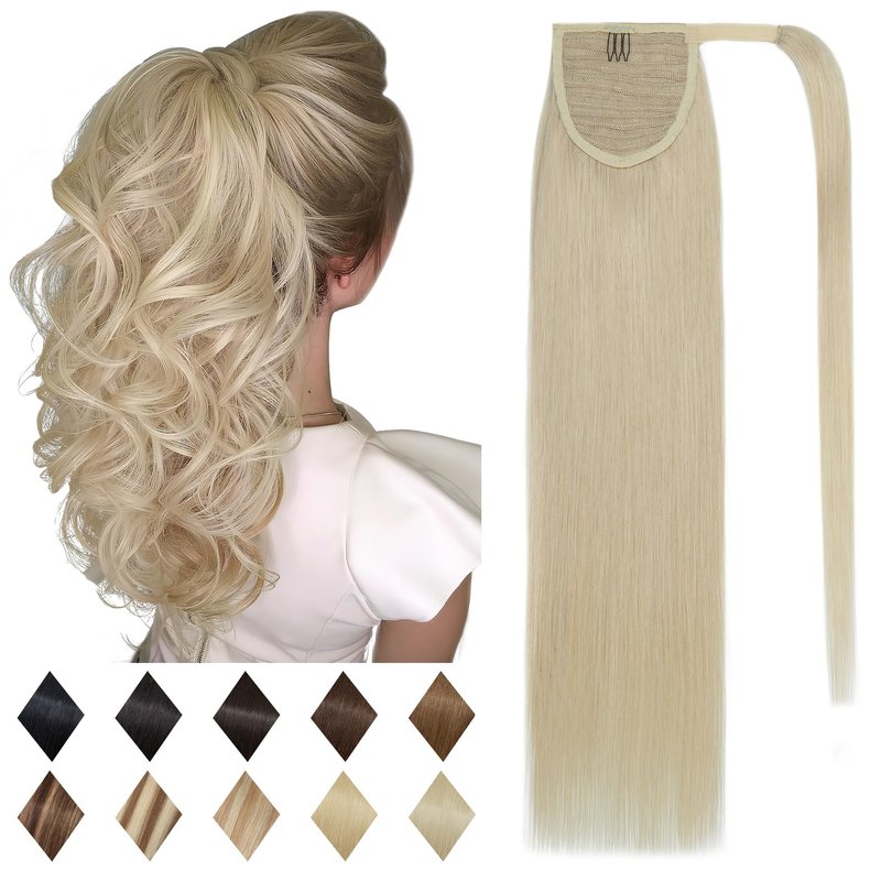 SEGO Ponytail Extension Human Hair Real Human Hair Clip In Wrap Around Long Straight Ponytail With Magic Paste Pony Hairpieces for Women -20 Inch 95g 60 Platinum Blonde