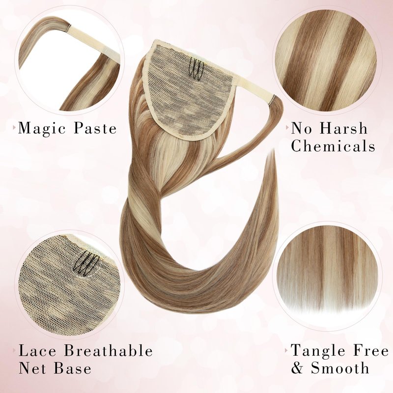 - 【Easy to use】Wrap Around Ponytail Hair Extensions: With magic paste and clip-in comb design, the ponytail can be easily fixed. Just wrap the hairpiece around ponytail and use bobby pins to secure it, easy and undetectable. No one will find your secret.