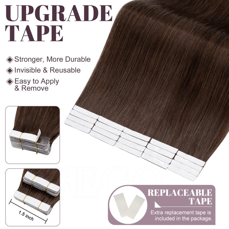 - 【Salon Quality Hair Extensions】SEGO tape in hair extensions human hair with 100% Remy human hair. Salon quality, tangle free, silky straight, soft, and smooth, blends in with natural hair when put on. Tape hair extensions can last 2-3 months with good care.