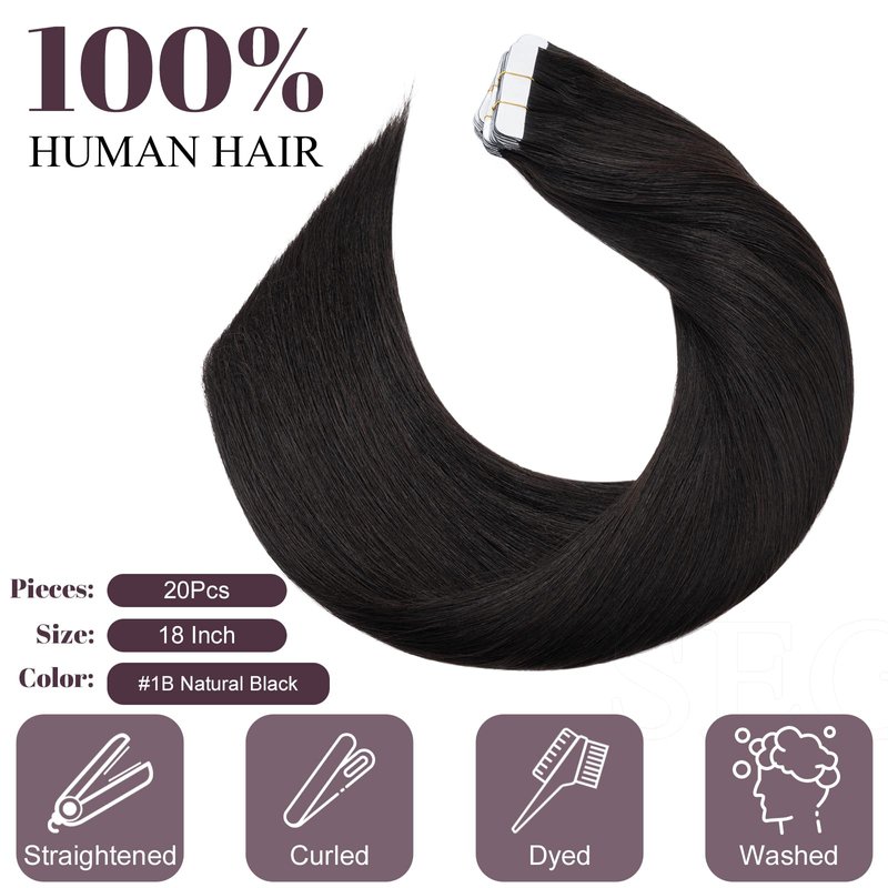 SEGO Tape in Hair Extensions Human Hair,Natural Black 18 Inch 50g/pack 20 pcs,100% Remy Human Hair Extensions Seamless Straight Silky Soft for Women (18 Inch #1B Natural Black)