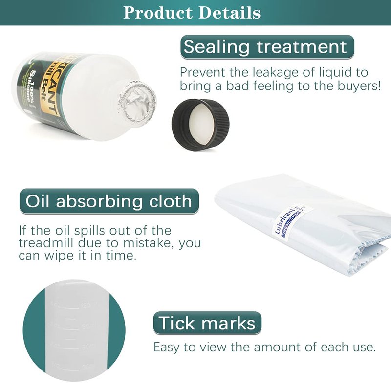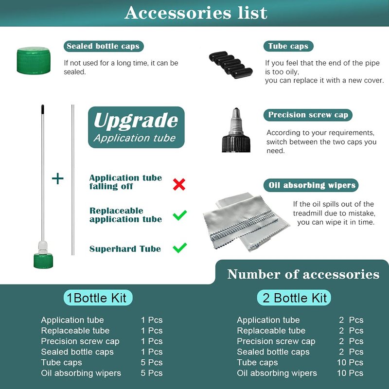 - Product set: 1 Bottle Set: 1 Bottle of 100% Silicon treadmill belt lubricant (≥ 4.2oz) + 1 Super hard application tube (easy to apply) + 1 Replacement application tube (choice) + 1 Precision screw cap (control the viscosity and flow of silicone oil) + 5 Pcs of Oil absorption cloth (can be wiped if the operation is wrong) + 1 Sealing cap (suitable for long-term storage) | 2 Bottle Set: All Accessories x2