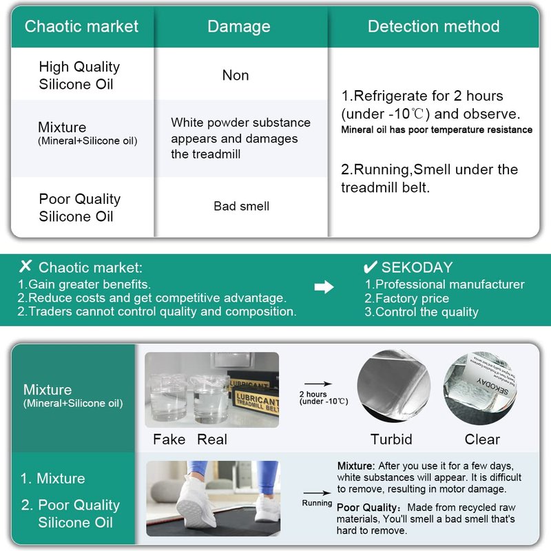 Reasons for choosing us: ✔ Professional production of customized silicone oil : - colorless and transparent, 100% silicon lubricant (Non-toxic and Colorless, High temperature resistance up to - 158 ℉~ 590 ℉, High stability and High lubricity) ✔2. Easy To Use : We independently developed super hard application tubes Perfect to Avoid the Disadvantages of Soft Tubes: -1. Cheap structure, easy to fall off -2. When in use, it is easy to be bent by the treadmill belt and increase the difficulty of extending to the middle of the treadmill belt. 3.Eliminate Mess - Easy to Apply and No Need to Loosen Your Treadmill Belt. 4. Principle of good faith management: NOTE: those unprofessional sellers tell you: silicon lubricant is suitable for all products lubrication!This is a misleading behavior! Silicon lubricant has a very good effect on plastic and rubber products, but silicon lubricant is only a kind of ingredient of metal lubricant, it can not completely replace metal lubricant (chain, metal gear, bearing, etc.), the effect is not ideal 5. 100% full refund guarantee for dissatisfaction! How to use? Method of application 1: 1.Lift the treadmill belt.((this is the best. It can be operated without lifting.)) 2.Slowly remove the tube and squeeze the silicone lubricant slowly until it reaches the edge of the treadmill belt. 3.Repeat on the other side of the treadmill. Method of application 2: 1.If your treadmill has a lubricant filler, you can fill it directly.
