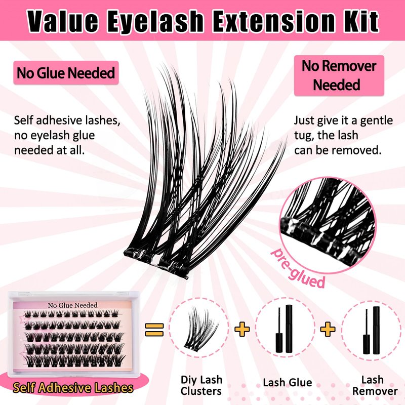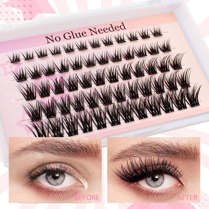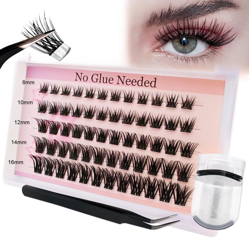 - Self Adhesive Eyelashes: The self adhesive lashes clusters kit contains 60 pcs pre glued lashes, eyelash curler and lash tweezer. No need for extra glue or waiting for it to dry, just use tweezers to place the cluster lashes under your natural lashes.