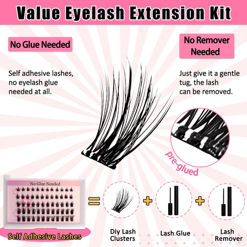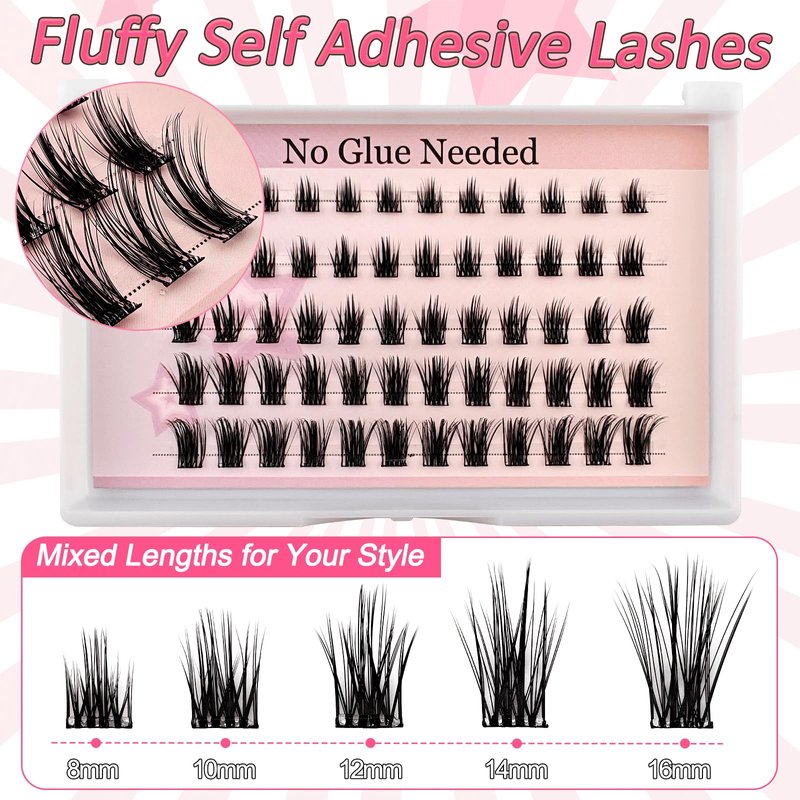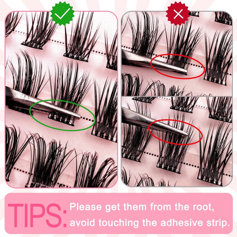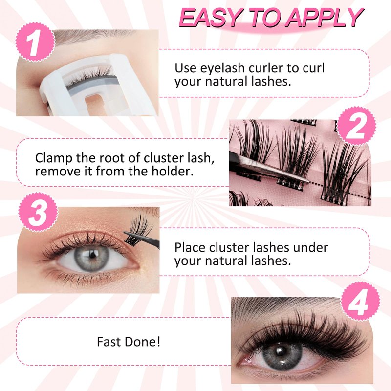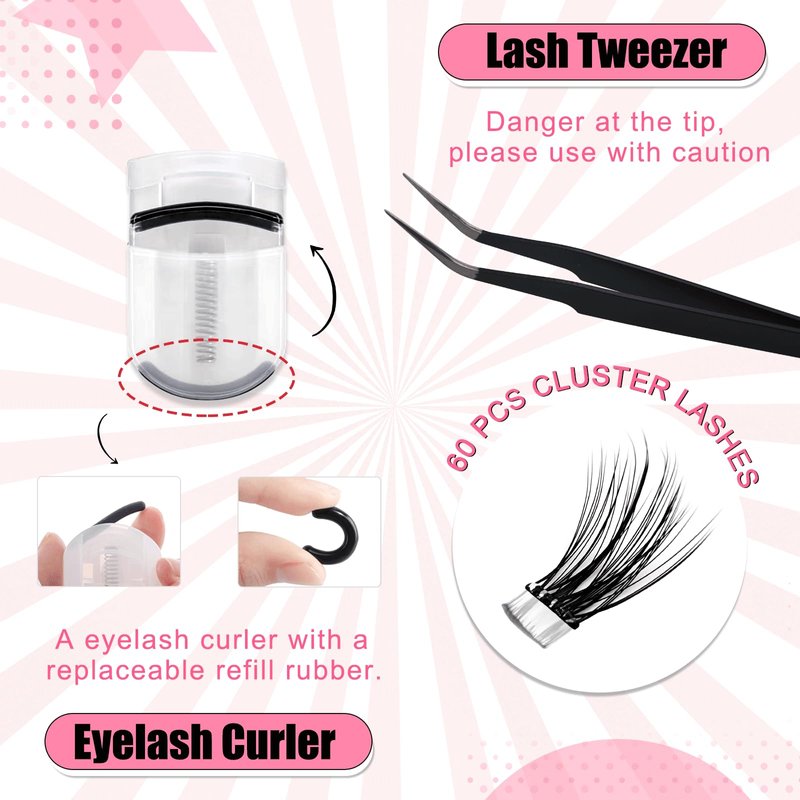 - Self Adhesive Eyelashes: The self adhesive lashes clusters kit contains 60 pcs pre glued lashes, eyelash curler and lash tweezer. No need for extra glue or waiting for it to dry, just use tweezers to place the cluster lashes under your natural lashes.