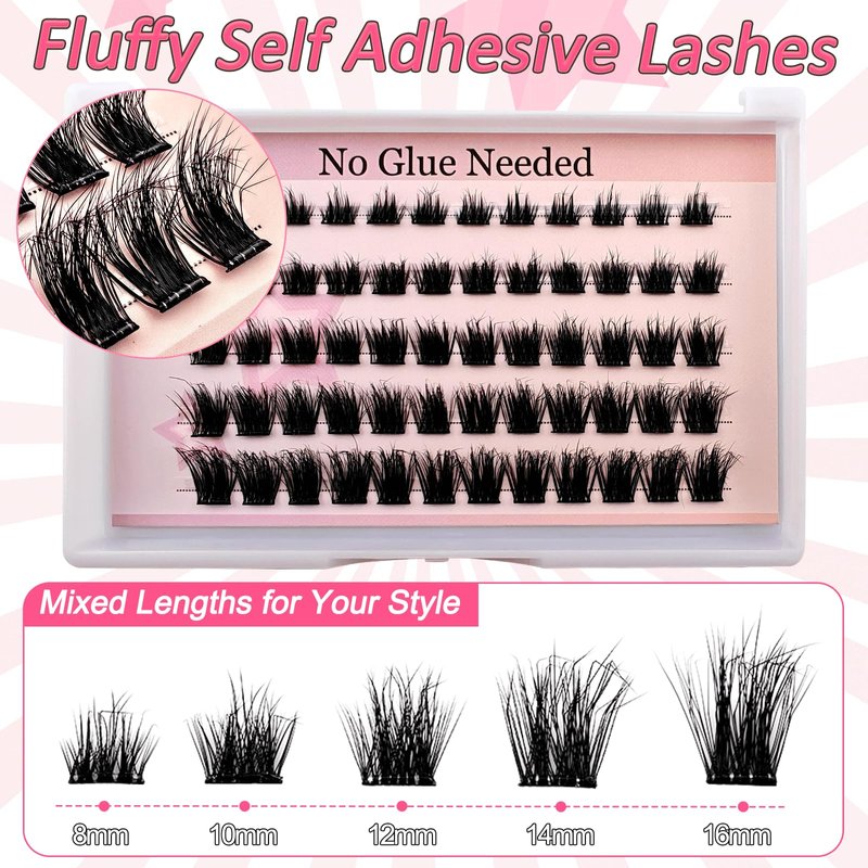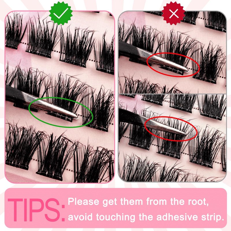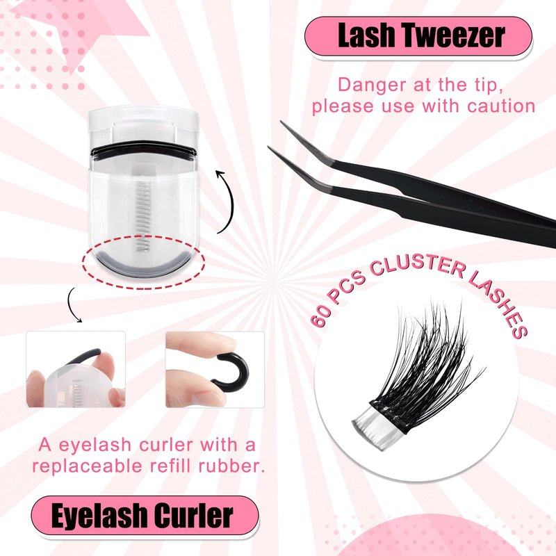 - Self Adhesive Eyelashes: The self adhesive lashes clusters kit contains 60 pcs pre glued lashes, eyelash curler and lash tweezer. No need for extra glue or waiting for it to dry, just use tweezers to place the cluster lashes under your natural lashes.