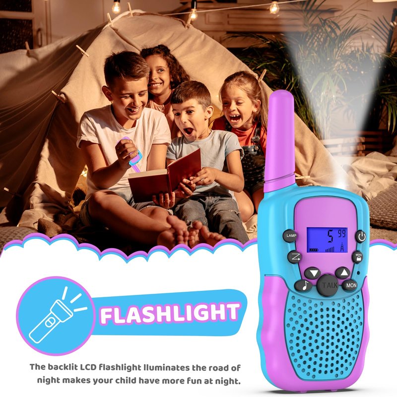 - Functional and Creative Design: Small and light body allow kids easy to use and just 90g per walkie talkie is easy to carry. An uncomplicated push-to-talk button makes the walkie talkies toy easy to use for kid. It also has a LCD display function.