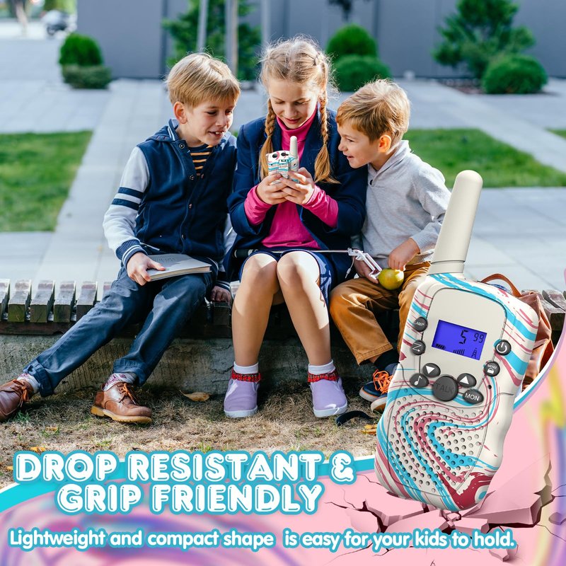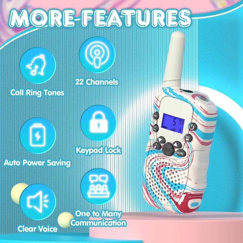 - 【Ergonomic Design】Featuring a small and lightweight body, our walkie talkies are easy for kids to hold in their hands. Each walkie talkie toy weighs only 90g, making them comfortable to carry around. An uncomplicated push-to-talk button makes this toy easy to use for girls age 3 4 5 6 7 8.
