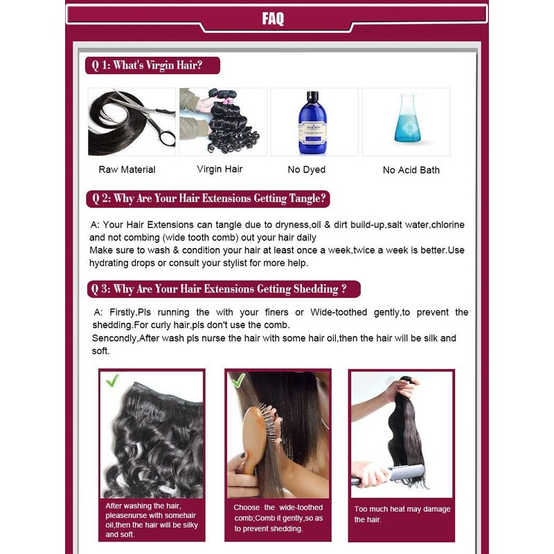 - 2.Hair Material : Brazilian Hair,100% Unprocessed Virgin Human Hair