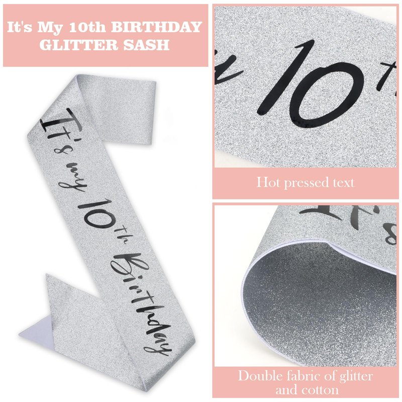 Semato 10th Birthday Decorations for Girls - Silver 10th Birthday Crown and Birthday Glitter Sash Kit for Girls 10th Birthday Gifts for Girls Birthday Party Supplies and Favors
