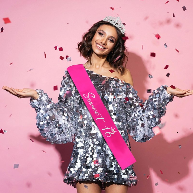 Semato 16th Birthday Tiara and Hot Pink Satin Sash Kit- Sweet 16" Birthday Decoration 16th Birthday Party Gifts Birthday Party Supplies for Girls (hot pink)