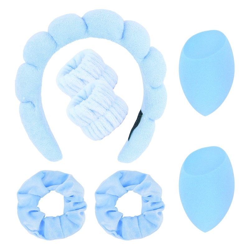 Semato 7pcs Spa Headband And Wristband Set with Velvet Scrunchies and Makeup Sponge Skincare For Washing Face Sponge Headband Bubble Headband Beauty Gifts For Women and Girls (blue)